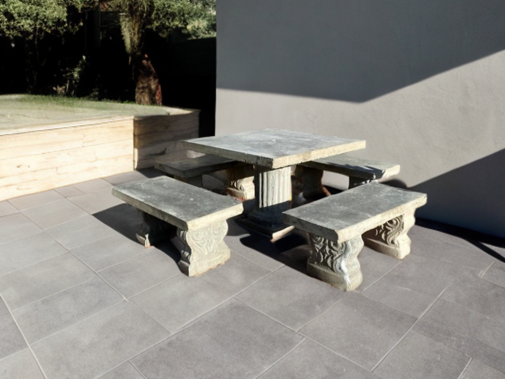 Mesa de jardín de 4 bancas rectangulares.