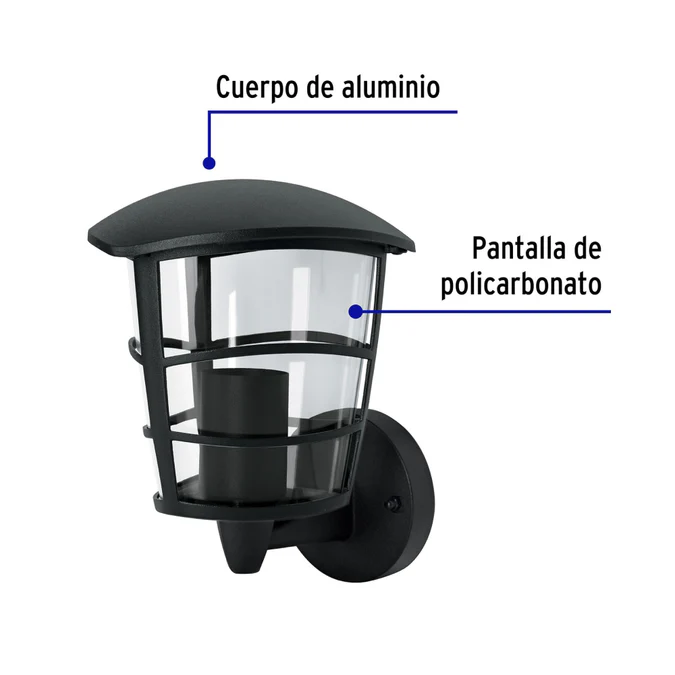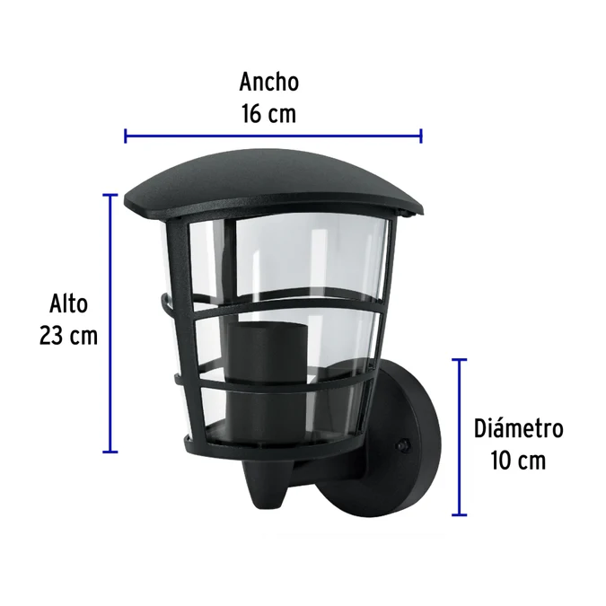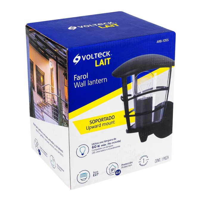 El arbotante tipo farol de Volteck es perfecto para iluminar exteriores como jardines, entradas, terrazas o corredores. Su cuerpo de aluminio y pantalla de policarbonato aseguran durabilidad y resistencia a la intemperie. Compatible con lamparas LED, incandescentes o ahorradoras (no incluidas), base E27 y grado de proteccion IP44, ofrece una iluminacion eficiente y elegante con hasta 60 W de potencia. Dimensiones: 230 x 160 x 100 mm.