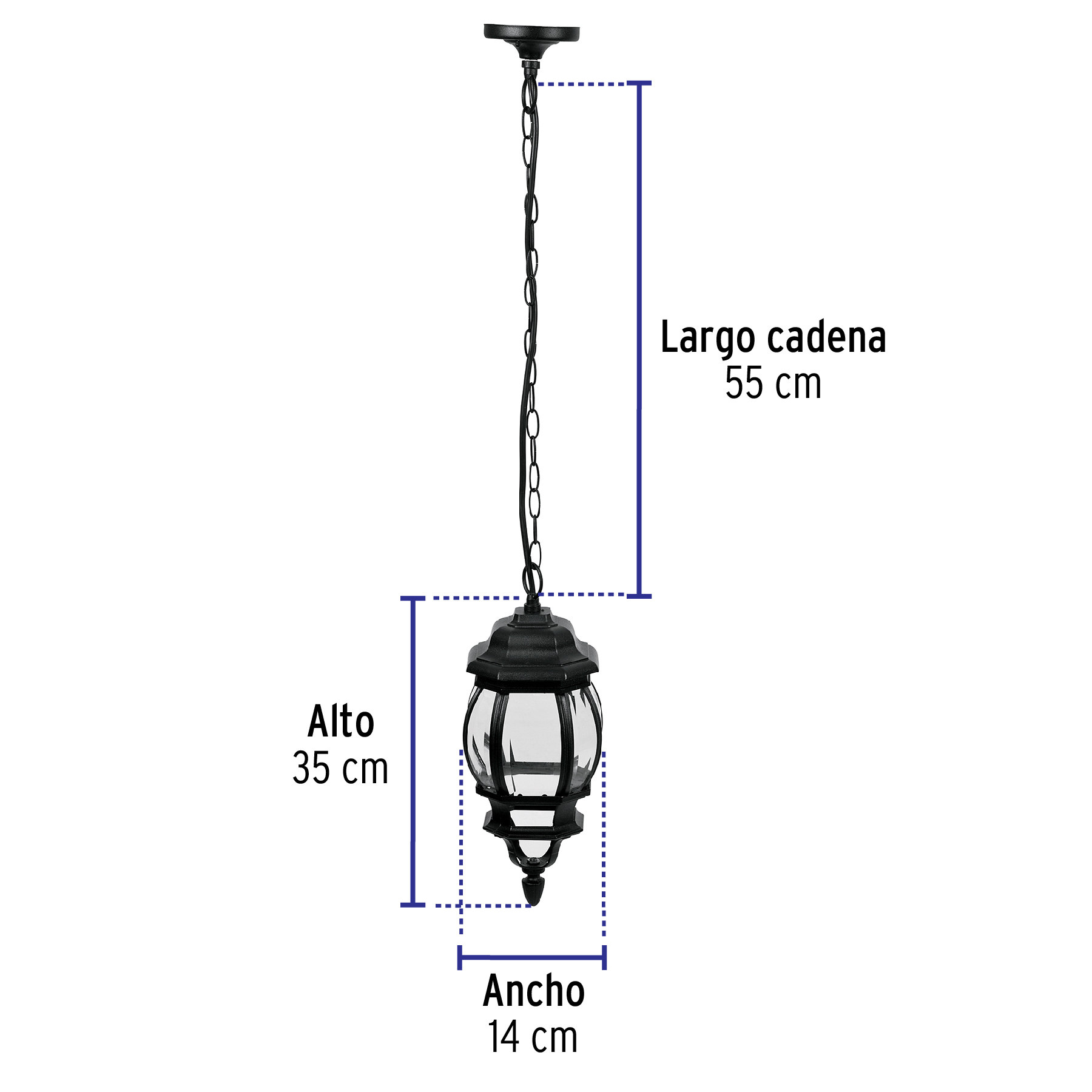 Arbotantes tipo farol (lámpara no incluida) VOLTECK CARACTERÍSTICAS: • Cuerpo de aluminio y pantalla de cristal transparente • Compatibles con lámpara LED o ahorradora (no incluida) • Ideales para jardines, terrazas, entradas y corredores ESPECIFICACIONES: • Acabado: Blanco • Potencia: 100 W • Tensión / Frecuencia: 120 V / 60 Hz • Corriente: 0.83 A • Dimensiones: 35 x 14cm y el largo de la cadena es de 55cm