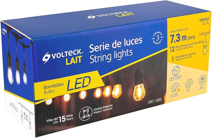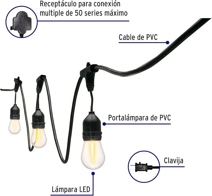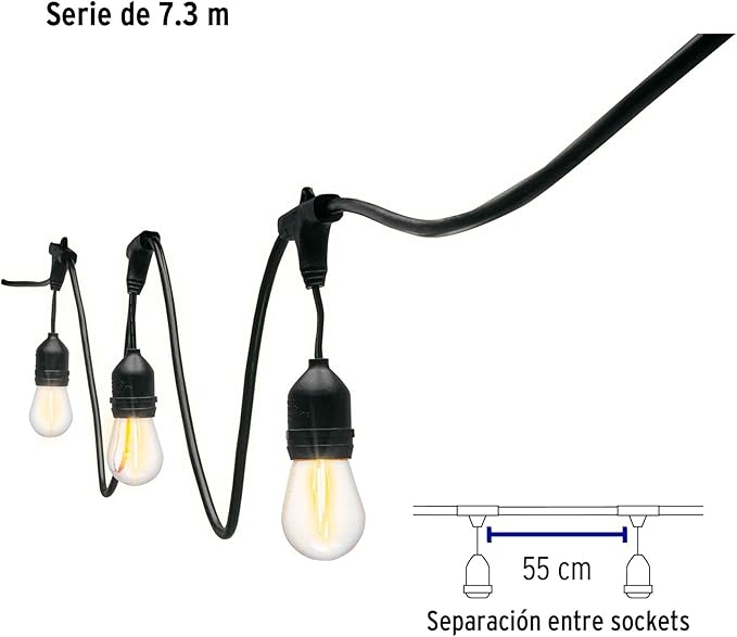 Compatibles con lámpara S14. Cable guía anclado a estructura. IP no aplica para unión entre lámpara y base. Cuide que la suma de las lámparas no sobrepase los 600 W ya que podría dañar el producto. Especificaciones Potencia: 1 W por lámpara Consumo total : 24 W Flujo luminoso: 60 lm por lámpara Tensión / Frecuencia: 127 V / 60 Hz Temperatura de color: 2 200 K / Luz cálida Largo total: 7.3 m Lámparas: 12 + 1 repuestos (incluidas)