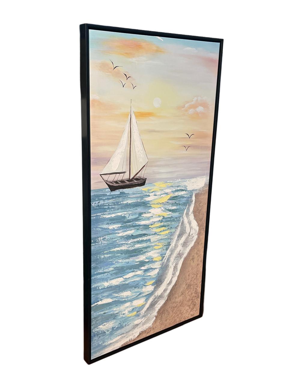 Cuadro de Bote en mar con marco de color negro. Medidas:50x100cm.