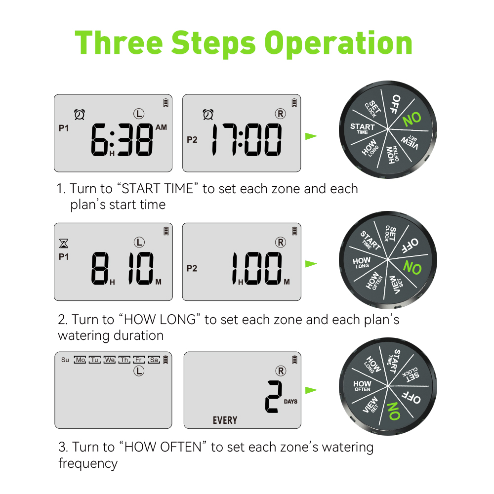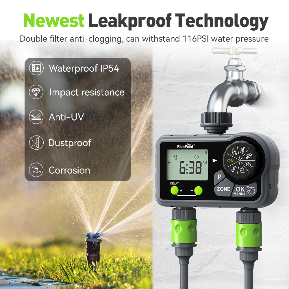 Temporizador de riego digital RainPoint para grifo de 3/4", con mas opciones de programación. Este temporizador, permite la ejecución de 3 programas de riego, de manera independiente o simultaneo para la cada zona, y adicional a ello te muestra en la pantalla LCD, los días de lunes a domingo, para la selección de irrigación.